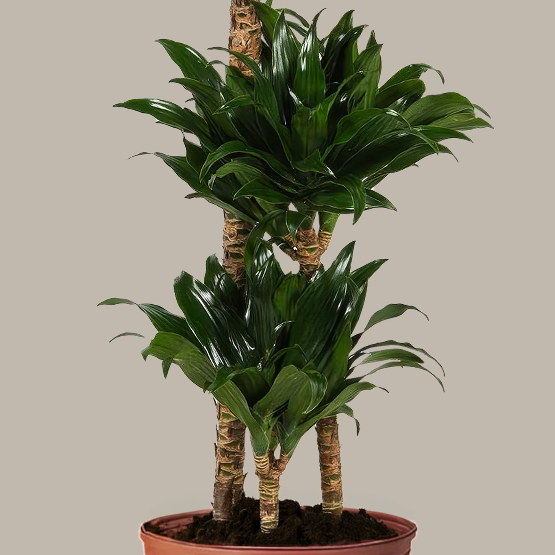 Dracaena, uzun ve zarif yapraklarıyla modern dekorasyonların vazgeçilmez bitkilerindendir. Üç gövdeli formu ise çok daha hacimli ve dengeli bir görünüm sunar. Farklı yükseklikteki üç gövde, bitkiye katmanlı bir estetik kazandırır ve mekânda güçlü bir duruş sağlar.