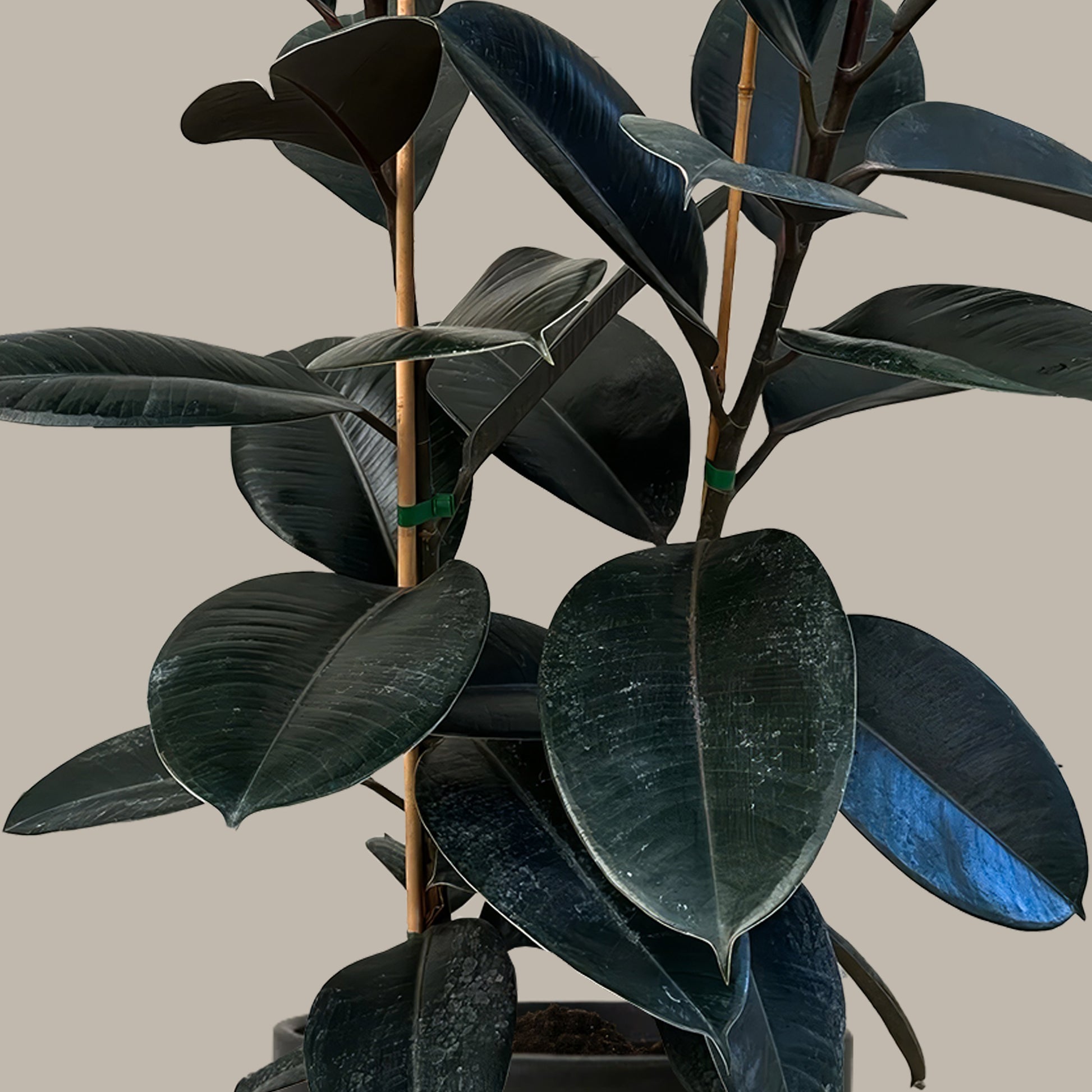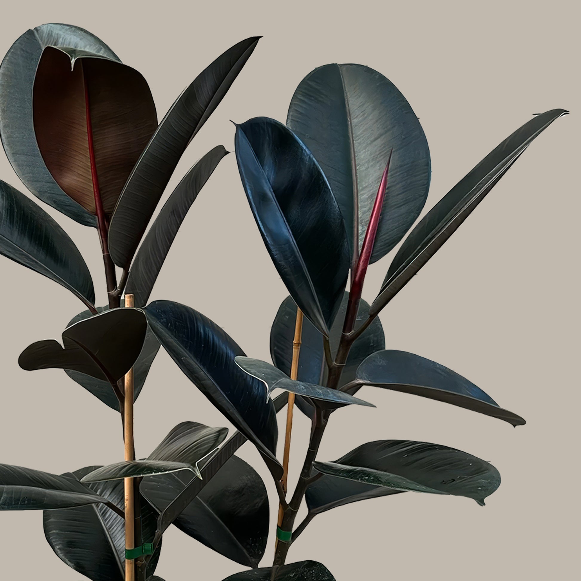 Kauçuk çiçeği, kalın ve parlak yapraklarıyla güçlü bir duruş sergileyen popüler bir iç mekan bitkisidir. Siyah tonlarındaki yaprakları sayesinde modern dekorasyonlarda özellikle tercih edilir. İki gövdeli formu, bitkiye daha dolgun ve simetrik bir görünüm kazandırır.